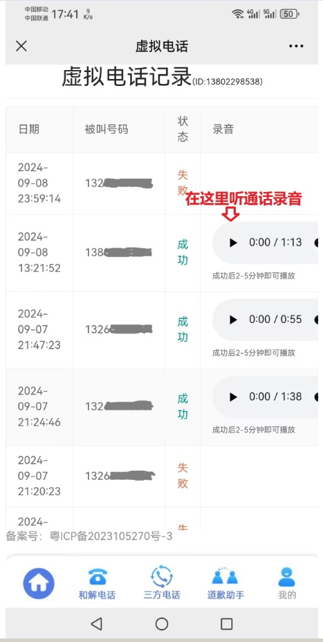 答:我们打给对方的号码对方不可能提前拉黑,所以一般情况下是可以接通对方的,但对方号码状态决定最终的接通率,如果对方是关机、飞行模式、勿扰模式、或者直接不接听的状态,那也是会接通失败的。和解宝电话如果对方没接通将会把预扣的费用退回帐户余额里,包括对方设置了勿扰或者飞行模式、关机、未接听等未接通的状况都会事后退费,只有正常接听了并形成了录音才会收费,所以这也是测试对方手机号码状态的的一个方法,如果能接听和解宝电话,也就可以确定可以使用三方电话接通对方聊天。相当于使用三方电话前测试对方号码状态的测试工具。
